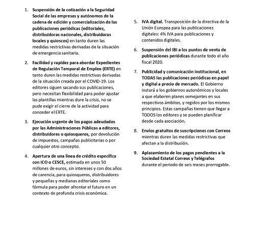 El cese de actividades impuesto por el Real-Decreto para la imposición del Estado de alarma en España para hacer frente al COVID-19 está haciendo tales estragos entre los editores de publicaciones periódicas que es urgente la puesta en marcha de un Plan de Choque de Ayudas a la Prensa, con medidas inmediatas, a corto y a medio plazo que garantice la continuidad de un servicio público esencial, en un contexto en el que la información es clave para combatir la crisis tanto sanitaria como económica y social provocadas por la pandemia.