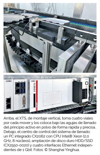 Al pasar al sistema de transporte lineal XTS, Shanghai Yinghua ha podido eliminar estos problemas propios del proceso y establecer nuevos estándares industriales en términos de rendimiento y calidad: en los raíles guía del sistema de transporte lineal, es posible montar un los movers que se deseen con un esfuerzo mecánico mínimo. Esta modalidad ofrece la flexibilidad necesaria para ajustar la línea de llenado a las capacidades de producción requeridas. Los movers pueden moverse individualmente, en grupo o sincronizados entre sí. Cuando se dosifican los polvos, por ejemplo, los movers pueden sujetar los viales para evitar que se caigan. De este modo, no solo se acelera el ciclo de producción y se reduce la tasa de errores, sino que también se suprimen los tiempos de inactividad para la limpieza, lo que constituye un requisito esencial para que la instalación pueda funcionar sin personal.