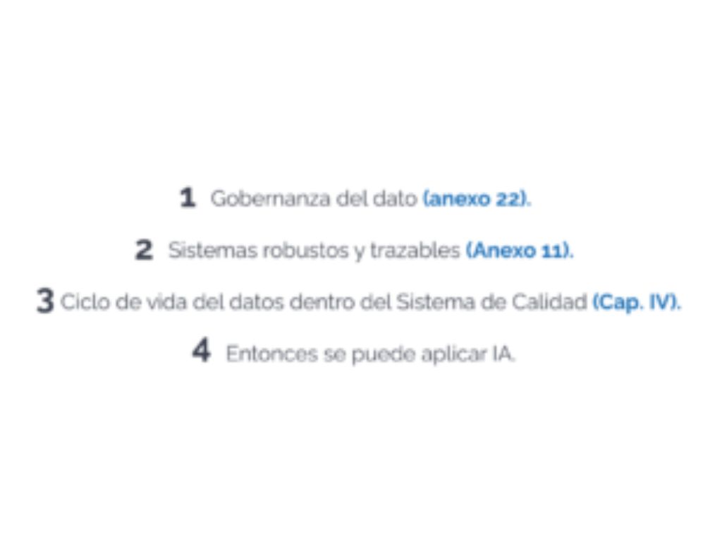 Sin una gobernanza adecuada del dato, la aplicación de IA en entornos GMP no es viable. Este enfoque regulatorio se convierte en un requisito indispensable para que, en un futuro cercano, podamos aplicar IA en tareas como la revisión automática de batch records, la detección predictiva de desviaciones, el análisis de tendencias de procesos o la liberación paramétrica asistida.