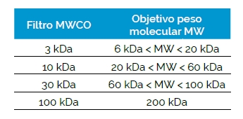 Considerando cuidadosamente el MWCO de la membrana de ultrafiltración, se puede lograr una óptima concentración, reduciendo la precipitación de proteína, y mejorar la eficiencia general en el proceso de filtración. Cuando se trabaja con muestras carentes de referencia, es recomendable inicialmente probar un filtro centrífugo con un MWCO que es la mitad del peso molecular de la molécula objetivo.