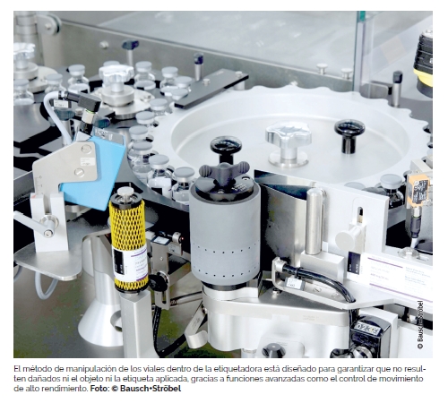 Gerald Kreft, programador del departamento de desarrollo de software/normalización de Bausch+Ströbel, explica otras características especiales que son importantes para el transporte de envases farmacéuticos: «La etiquetadora ESA1025 también puede procesar objetos con paredes muy finas (como las viales) o frágiles (como las ampollas con anillo de aplastamiento). Además, es esencial asegurarse de que el objeto etiquetado no presente signos de daños estéticos (por ejemplo, de impresión). Es precisamente por eso el transporte de paso tiene que ser lo menos estresante posible». En materia de etiquetado, es esencial apoyar la tendencia actual de abandonar los soportes de papel en favor de soportes de plástico con paredes tan finas como sea posible, como señala Gerald Kreft: «En comparación con los de papel, los soportes de plástico son mucho más inestables, es decir, más propensos a estirarse. Este comportamiento dificulta notablemente el procesamiento a alta velocidad. Sin embargo, con nuestro nuevo dispensador de etiquetas, la impresión puede desacoplarse del proceso de etiquetado mediante un servoaccionamiento independiente, lo que nos permite lograr un posicionamiento rápido y preciso de la impresión incluso con sustratos de plástico».
