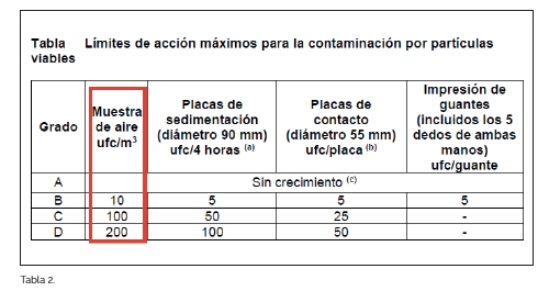 Según establece la norma, la monitorización microbiológica de salas limpias debe corresponderse con el grado de esta, por lo que según la tabla 6 de la parte 9, correspondería realizar la monitorización para un volumen concreto de aire o gas (1 m3) haciéndolo impactar sobre un medio de crecimiento específico para bacterias y hongos en placas de Petri. Los límites de detección son los siguientes, en Unidades Formadoras de Colonias (UFC):