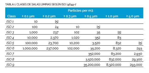 La base para evaluar la calidad de una sala blanca o de las correspondientes zonas de sala blanca, como una cabina de flujo laminar, la proporciona la norma DIN EN ISO 14644, según la cual se realizan las clasificaciones de las salas blancas. Las distintas clases ISO se resumen en la tabla 1.