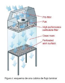 Una cabina de flujo laminar, por ejemplo, la cabina que se utilizó en este artículo, está clasificada en la clase ISO 5 (clase 100 en EE.UU.), lo que significa que en su interior pueden detectarse un máximo de 100 partículas de al menos 0,5 µm de diámetro por pie cúbico (3,5 partículas por litro o 3.520 partículas por m3). Por tanto, la cabina Flow Box tiene un factor de aislamiento de 104 y, en consecuencia, reduce el número de partículas y mejora la calidad del aire al menos 10.000 veces en comparación con el aire ambiente del laboratorio. La imagen de la figura 1 muestra la estructura y el modo de funcionamientouna de una cabina de flujo laminar. La función es bastante simple: El aire ambiental es aspirado por un ventilador y forzado a través de un filtro de partículas, cuya disposición crea un flujo de aire laminar en el área de trabajo. Esto significa que el aire fluye de arriba a abajo en líneas paralelas y la muestra está protegida contra la penetración de partículas. Las partículas que, sin embargo, han entrado son capturadas por el flujo y descargadas a través de la abertura frontal.
