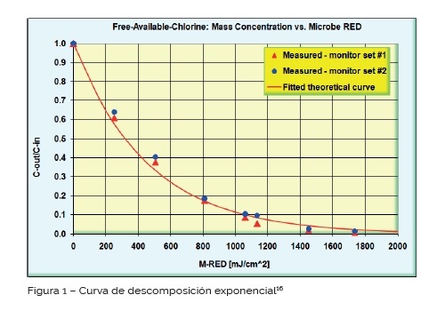 Como se puede ver en la Figura 1, la foto-desactivación sigue una curva de descomposición exponencial, la dosis necesaria para reducir 1 ppm de cloro libre está por encima de 1700 mJ/cm2.