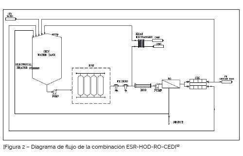 Como se puede observar en la Figura 3, el sistema comienza con un tanque de agua ciudad, unidades ESR y HOD con filtración intermedia. Esta agua pretratada se alimenta directamente a una combinación RO-CEDI.