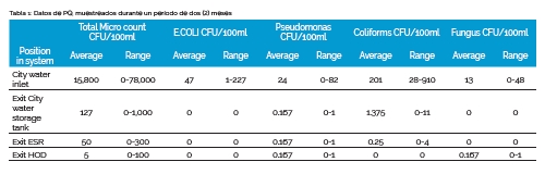 Como se puede observar en la Tabla 1 anterior, los recuentos microbianos totales se reducen en 4 log. Como los estándares microbianos EP para WFI son <10 ufc/100 ml [2], el agua de alimentación de RO cumple con los estándares microbianos de WFI antes de pasar a través de la membrana de RO. La reducción de Pseudomonas es especialmente significativa ya que este tipo de patógeno genera biopelículas y es tenaz en su adherencia a las superficies y, por lo general, es resistente a la mayoría de los tipos de procedimientos de sanitización.
