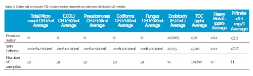 La Tabla 2 demuestra que el agua producida tiene un recuento total indetectable y ninguna otra especie microbiana; LAL, TOC, metales pesados y nitratos cumplen con los criterios de agua de WFI.