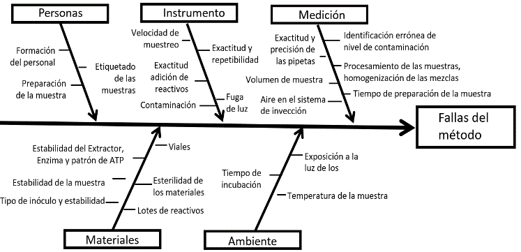 Los posibles modos de fallo (variabilidad en la señal analítica) del método fueron examinados a través de discusiones con los técnicos experimentados y se construyó un diagrama Ishikawa (Figura 2).