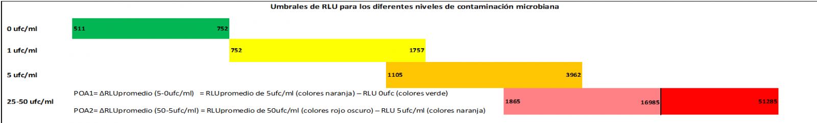 El establecimiento de los umbrales de contaminación permite definir de manera rápida y visible desde la pantalla del ordenador usando códigos de colores o a través de valores numéricos de RLU, el nivel de contaminación. Así, rápidamente se visualiza si una muestra de agua está contaminada y que valor de contaminación presenta en ufc/ml. Permite establecer y validar el POA1 y POA2 (5 y 50 ufc/ml) correspondiente a los niveles de alerta y alarma respectivamente. Estos umbrales son las correspondientes distribuciones poblacionales de valores de RLU (para una n 35-100) de los inóculos de: 0, 1, 5, 25, y 50 ufc/ml previamente preparados. Estos umbrales están definidos por las medias poblacionales y por sus intervalos de confianza para cada nivel de contaminación de los inóculos. Cada valor de RLU usado en los cálculos es la media de 2 mediciones.
