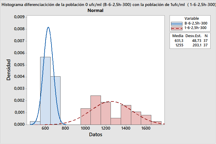 Figura 4 Diferenciación estadística, histogramas de las distribución poblacionales de valores de RLU para 0 ufc/ml verde en la Figura 3 con la población de RLU de 1 ufc/ml (amarillo en la Figura 3).