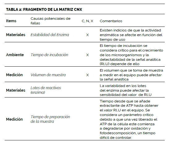 Las posibles causas de fracaso o variabilidad en la señal analítica (RLU) se evaluaron con un modelo CNX (Tabla 2).