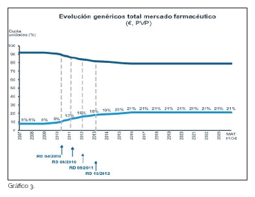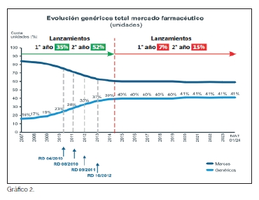 La evolución del mercado de genéricos en España, en términos de unidades, es la que se representa en el siguiente gráfico:
