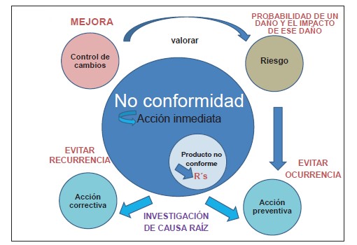 • La gestión del riesgo parte de una situación potencial, no de un incumplimiento. Por tanto, las acciones que en algún momento se llegaran a requerir para controlar el riesgo tienen una naturaleza preventiva. Pero, a diferencia de la acción preventiva derivada de la no conformidad, estas acciones de control de riesgo no tienen este origen y representan el enfoque actual de las agencias sanitarias: el preocuparse por lo que no ha sucedido y actuar en consecuencia y no esperar a tener algún incumplimiento.