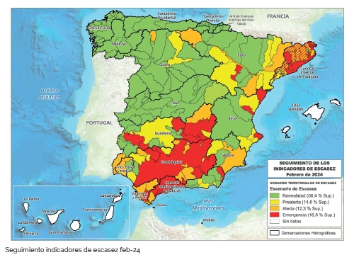 El año hidrológico 2023 tuvo un carácter globalmente seco en el conjunto de España. Como consecuencia, el 14,6% del territorio nacional está en situación de emergencia por escasez de agua y el 27,4% en alerta.