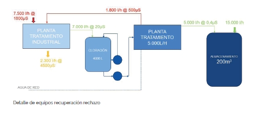 Para conseguir el doble objetivo buscado, se propuso reutilizar el rechazo de la etapa de ósmosis aproximadamente 7.500 l/h y hacerlo pasar por un equipo de ósmosis industrial, almacenar el agua producto en un depósito donde el agua era clorada para garantizar la ausencia de contaminación y, de ahí, alimentar un equipo de producción de agua purificada para una producción de 5.000 l/h a sumar a los 15.000 l/h disponibles. Vemos en las ilustraciones 7 y 8 diagrama conceptual de la instalación llevada a cabo.