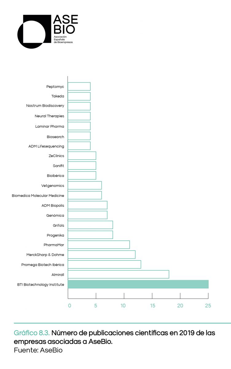 En el apartado referente a la producción de conocimiento científico de las empresas españolas, se destaca a BTI Biotechnology Institute como la empresa española con mayor número de publicaciones en revistas científicas de impacto: 25 en total.
