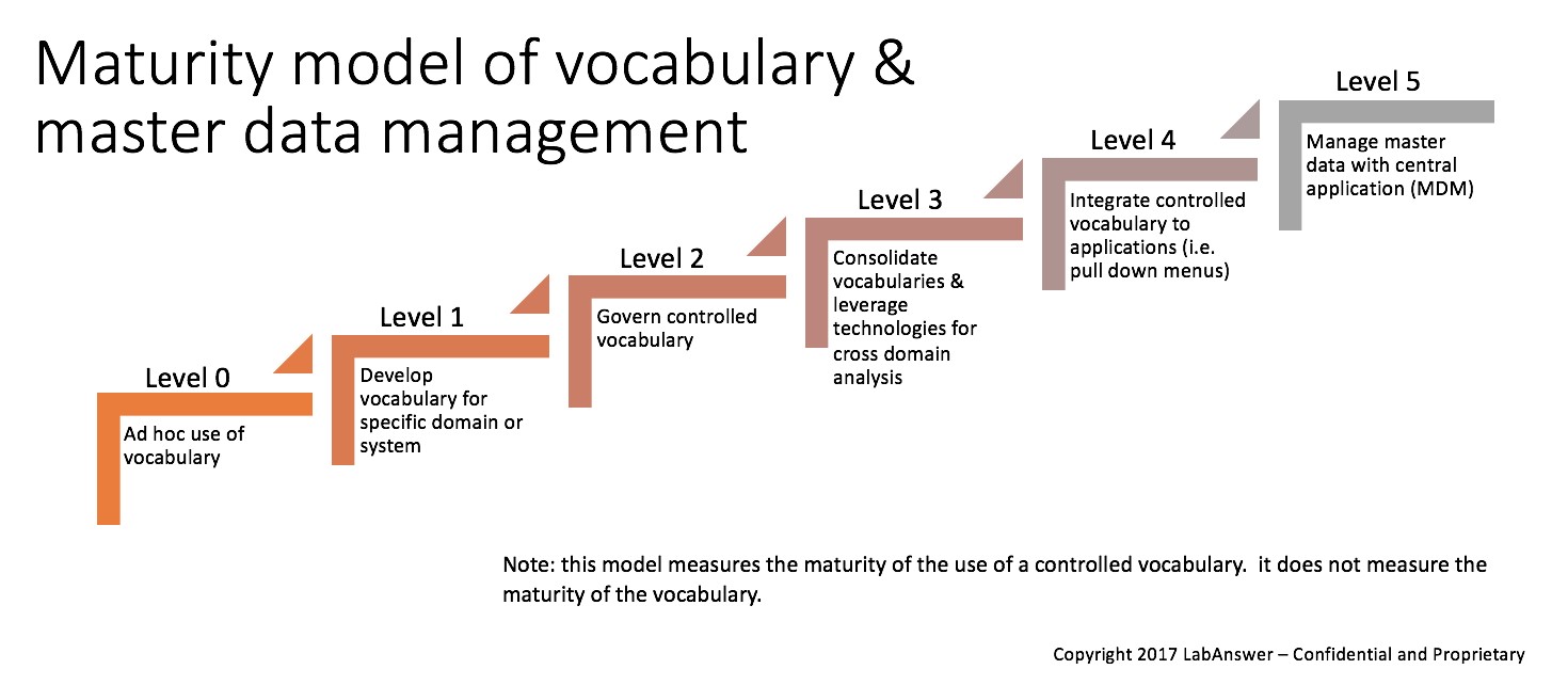 Las discusiones empezaron desde el primer momento en el que un laboratorio inicia su transformación “Paperless”. Pat Pijanowski, socio de LabAnswer, explicó que "las soluciones de transformación deben partir de una estrategia global de datos”,destacando la importancia de realizar antes de nada un trabajo de base que permita evaluarse y posicionarse frente a los 6 diferentes niveles que presenta el modelo de madurez de vocabulario y Master Data Management (MDM).