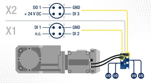 Con un módulo de 8 E/S puede controlar dos Smart Motor Lenze. La conexión binaria del motor proporciona tres entradas digitales y una salida, distribuidas en dos líneas M12.