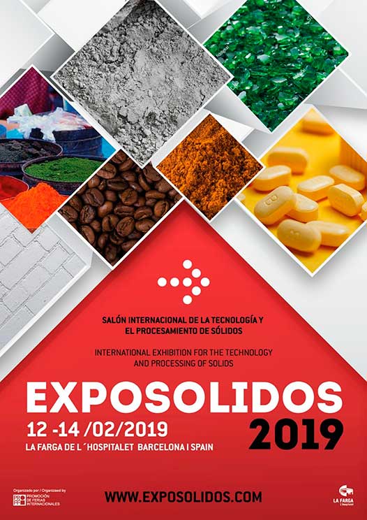 EXPOSOLIDOS, Salón de la Tecnología y Procesamiento de Sólidos, es la principal feria del sur de Europa especializada en la manipulación y procesamiento de sólidos, semi sólidos y separación de sólidos y líquidos, celebrará su próxima edición, la novena, los días 12, 13 y 14 de febrero de 2019 en La Farga de L’Hospitalet de Llobregat (Barcelona), sede del certamen desde su primera edición.