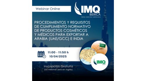 IMQ Ibérica organiza un webinar gratuito dirigido a empresas del sector cosmético y médico interesadas en la exportación a mercados estratégicos como Arabia Saudí (UAE/GCC) e India. La sesión abordará los procedimientos clave y requisitos normativos necesarios para cumplir con éxito en estos países. El evento tendrá lugar el 10 de abril de 2025, de 11:00 a 11:50 (hora española), en modalidad online y en inglés, y será conducido por IMQ Gulf, expertos en certificación y n