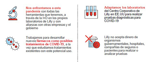 Ante la gravedad de la situación, Lilly realizó una reorganización de sus funciones para poder aportar todo el conocimiento científico y médico para afrontar esta pandemia sin desatender al resto de las necesidades médicas. Así, puso en marcha un intenso programa de investigación para entender el potencial que podrían tener fármacos de Lilly ya existentes para frenar una enfermedad que ha causado cerca de 2 millones de muertes en todo el mundo, al tiempo que iniciaba distintos acuerdos con empresas biotecnológicas que necesitan del conocimiento de Lilly para desarrollar sus programas de investigación preclínica y clínica.