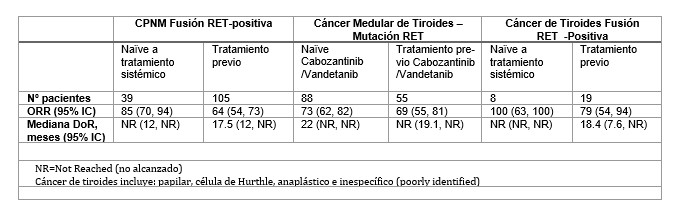 Hasta el 50% de los pacientes con CPNM con fusión del gen RET tienen tumores que metastatizan en el cerebro. Entre los pacientes con CPNM previamente tratados con metástasis medibles en el cerebro, 10 de los 11 experimentaron respuestas intracraneales y los diez obtuvieron una duración de la respuesta en SNC igual o mayor a seis meses.