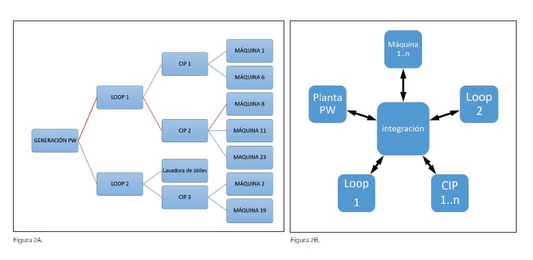- Proveedores que abran, con la seguridad adecuada, sus sistemas, hasta ahora cerrados a cal y canto, para comunicarse de forma amigable con el resto de sistemas que también estarán abiertos. Para entender esto, un ejemplo de intercomunicación de sistemas independiente sería: Una máquina (sistema 1, S1) que dispone de un complejo equipo de limpieza de tanques (sistema 2, S2) del tipo CIP (cleaning in place), el cual utiliza agua purificada de la planta de aguas (sistema 3, S3). Para asegurar el funcionamiento coordinado de los tres sistemas se deberá programar que S3 suministre a S2 el volumen necesario y suficiente de agua, el día y hora programados, para realizar la limpieza de del tanque del S1. Es decir, tres sistemas independientes e interconectados aseguran la limpieza del tanque. Estos sistemas están a su vez conectados con otros para evitar la aparición del fenómeno del cuello de botella y producir lo que sea necesario para evitar desperdicios. En la Figura 2A se muestra el enfoque tradicional con contactos y cableado. La máquina 8 genera una orden para que el CIP2 realice un ciclo de lavado. CIP2 ejecuta la orden y consume agua del loop1, y Generación PW, al bajar el nivel de agua en su tanque, genera el agua necesaria para llenar el tanque.