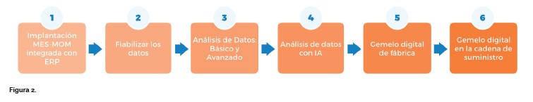 Hacer efectiva esta transformación de la gestión requiere tiempo y compromiso de la alta dirección, y, no olvidar que la digitalización no es en sí un objetivo final, sino el facilitador para tomar decisiones de mejora y estratégicas en tiempo real (Smart Factory). Para aquellas industrias que ya disponen de un plan de digitalización recomendamos seguir la siguiente hoja de ruta basada en nuestra experiencia (figura 2).