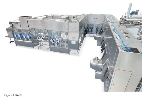 Un RABS (Restricted Area Barrier System) es un área cubierta por flujo unidireccional Grado A cuyo perímetro está totalmente cerrado por una barrera rígida, que impide la interacción con el interior mientras se desarrolla el proceso aséptico (figura 2). En general, cualquier manipulación durante el proceso debe hacerse a través de un paso de guantes o a través de dispositivos mecánicos a distancia, y cualquier paso de materiales al interior debe hacerse a través de un sistema que asegure la esterilidad: salida de túnel de despirogenización, SAS con descontaminación, RTP (Rapid Tranasfer Port), válvulas alfa/beta o sistemas similares.