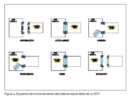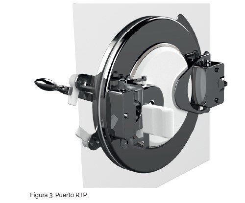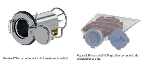 Asociados a los aisladores se han desarrollado los sistemas de transferencia rápida RTP (Rapid Transfer Port) (figura 3). La base de este tipo de puertos es similar a las split valves utilizadas en los sistemas de contención: un sistema de cierre compuesto por dos cuerpos, alpha y beta, que mantienen las condiciones asépticas cuando se acoplan y desacoplan para permitir una conexión y desconexión seguras entre dos cámaras (figura 4). La parte alpha o activa se instala en la cámara del aislador o RABS y cierra esta herméticamente; la parte beta o pasiva se instala en el contendor que transporta los materiales estériles a introducir, que también es estéril en su interior (figura 5). Cuando las partes alpha y beta (figura 6) se acoplan, forman un conjunto único cuyas caras son estériles y puede abrirse como una sola pieza, conectando de forma segura el interior del contenedor estéril con el interior de la cámara estéril.