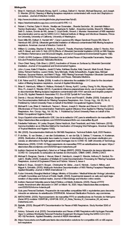 Respecto al uso de H2O2 vaporizado, Batelle26 y Schwartz et al.27, se posicionan a favor de su eficacia, indicando estabilidad en los elementos de ajuste (bandas elásticas) de las mascarillas hasta 30 ciclos y en la estructura filtrante exterior e interior hasta en 50.