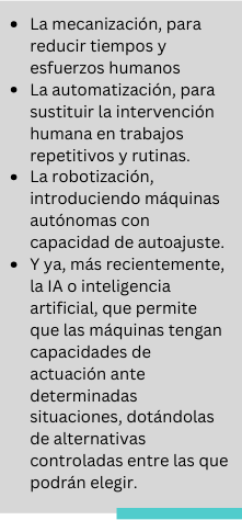 La necesidad de evolucionar hacia objetivos de calidad total, de ‘0 defectos’ y, en resumen, de mejorar la competitividad empresarial han empujado a la industria a adoptar constantemente nuevas tecnologías, no sólo para ser eficientes, sino para seguir en el mercado. Así, lo que empezó siendo un sistema para agilizar trabajos repetitivos que precisan mucho esfuerzo humano, ha llevado a la industria a transitar por diferentes fases:
