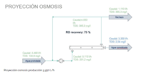 Quere esto decir que, de cada 100 litros que entran al equipo, 75 litros son de agua tratada y 25 litros irían directamente al rechazo.