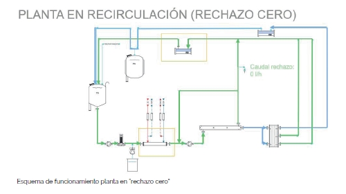 Según comentado, cuando el depósito de acumulación está lleno, la planta recupera a cabecera el agua que se tira a rechazo, evitando de esta manera tener ninguna pérdida de agua en esta situación.