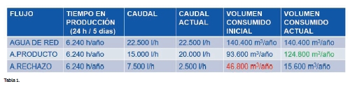 De esta forma los resultados han sido los buscados, aumentando en un 33% la capacidad de producción de la instalación en su conjunto y siendo capaces de ahorrar un 67% del agua que anteriormente se tiraba a desagüe. Lo podemos ver en la siguiente tabla: