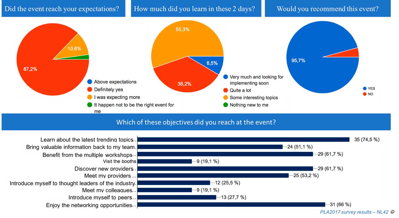 El resultado de la encuesta de satisfacción confirma que los tres pilares del evento, presentaciones de contenido, no comerciales, talleres patrocinados y sesiones de networking agradables, hacen de este evento único y son reconocidos por patrocinadores y visitantes como la combinación clave para uno de los mejores eventos europeos en su categoría.
