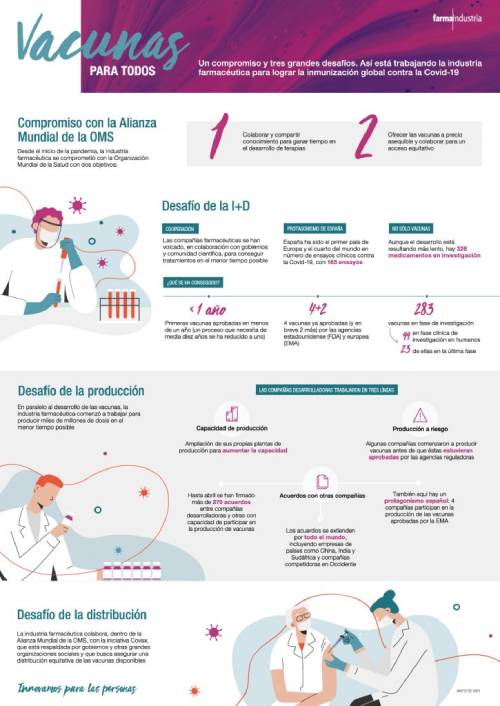 Desde Farmaindustria se recuerda que apenas 9 meses después de que el 11 de marzo de 2020 la Organización Mundial de la Salud declarara de manera oficial la pandemia ya se estaba administrando la primera vacuna, y hoy, 14 meses de aquel marzo de 2020, ya hay cuatro vacunas contra la Covid-19 aprobadas por las agencias estadounidense (FDA) y europea (EMA), en breve se espera la llegada de dos más y más de una veintena está en la última etapa de investigación. Una infografía de Farmaindustria resume cómo se ha conseguido esta hazaña sin precedentes y cuáles son los compromisos y los grandes desafíos a los que está tratando de dar respuesta este sector en todo el mundo.