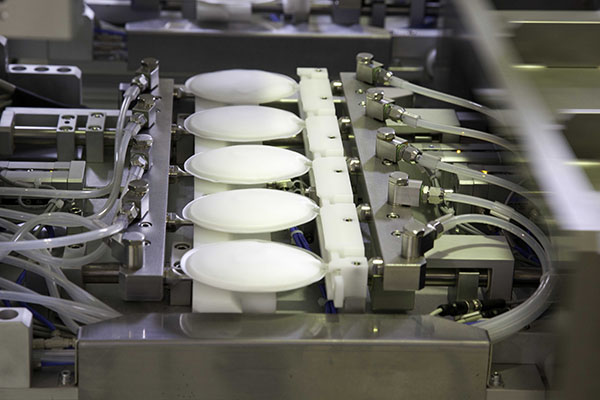 Filtros de sangre con control de estanqueidad con helio con una estación de control en cámara de vacío. Permite la carga-descarga de los componentes mediante 4 ejes lineales automáticos.