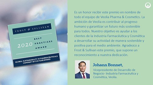 El equipo de la industria farmacéutica y cosmética de Veolia ha tenido el honor de recibir el Premio a la Compañía del Año en la categoría de Sostenibilidad, otorgado por Frost & Sullivan. Estos premios a las Mejores Prácticas, reconoce a las empresas en varios mercados regionales y globales que demuestran logros sobresalientes y desempeño superior en áreas tales como liderazgo, innovación tecnológica, servicio al cliente y desarrollo estratégico y de producto.